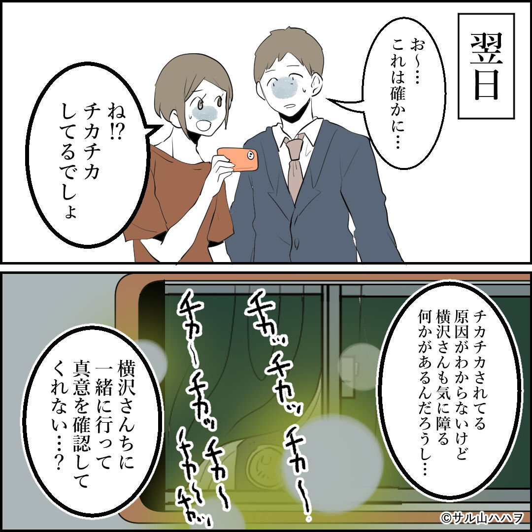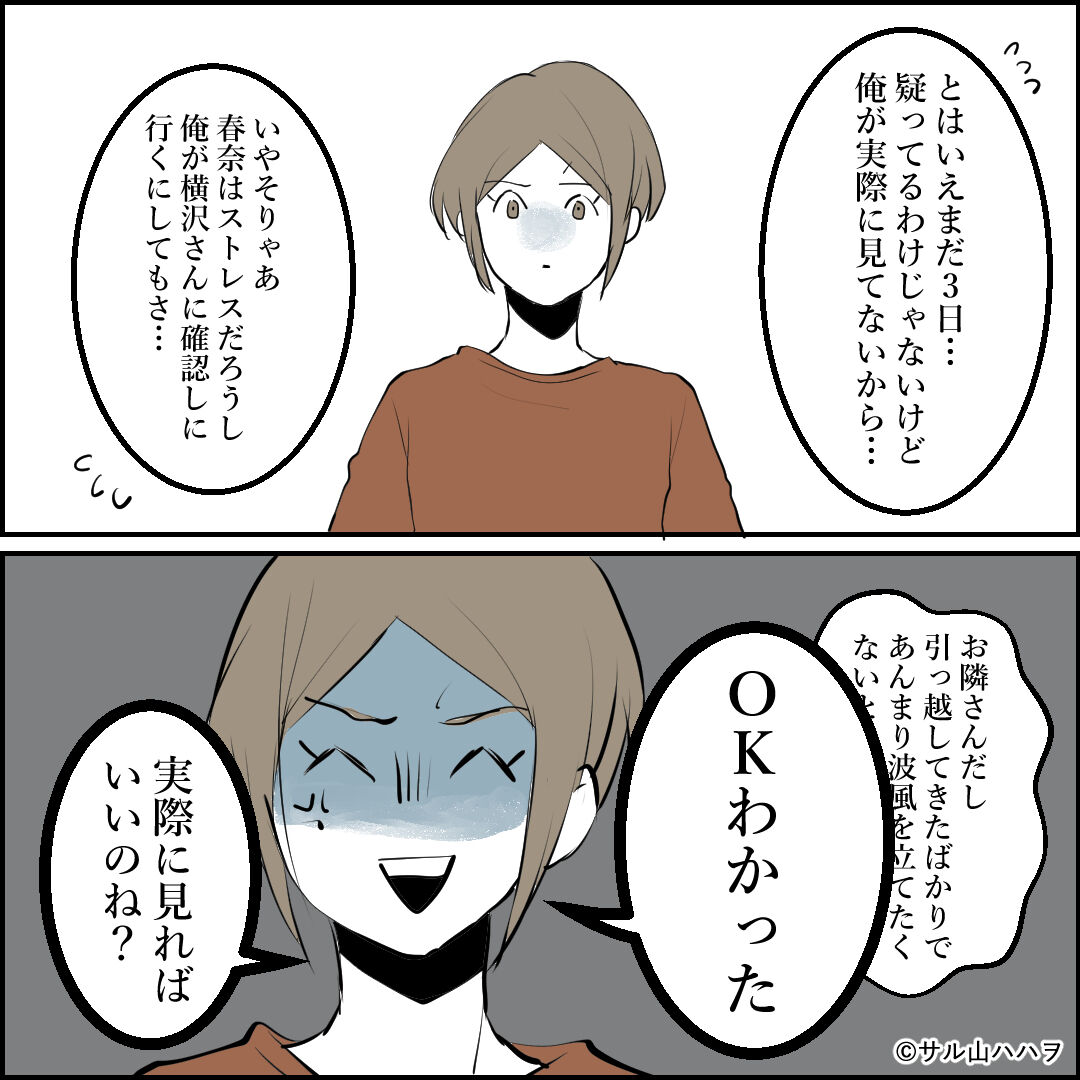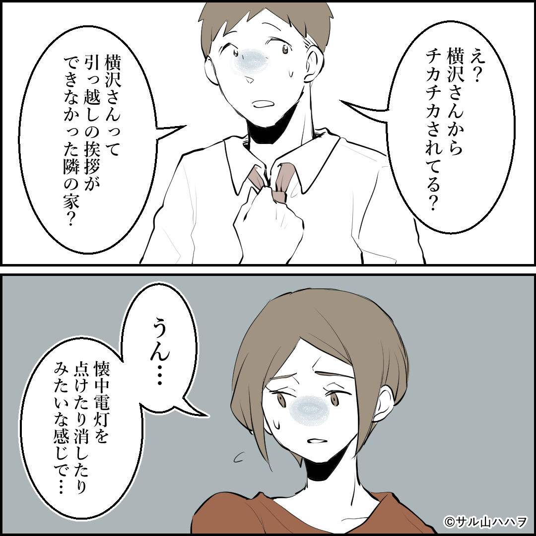 隣の家からのチカチカが止まない話【05】「優柔」 2022/09/08 【連載】隣の家からのチカチカが止まない話実話にフェイクを入れてフィクションにしています。【前の話】 【最初から読む】 判断に迷う話実害はないけど地味にストレスだしエスカレートしたら…と思うと乗り込みたいけど、乗り込むのも強い心が必要だし逆にエスカレートするかもだし…とか考えると判断するの難しい…【次のお話】 【他の裏マンガ】\不倫相手が結婚式に来た話/ \初婚の妻が別の男と結婚してた話/ \無神経な後輩がつらい先輩の話/ \パパの不倫を追跡した話/ 実際に乗り込むのは躊躇するなぁ… 「隣家のチカチカが止まない」カテゴリの最新記事 タグ :#連載#漫画#隣人トラブル#コミックエッセイ#衝撃#一戸建て#ブログ#修羅場#漫画が読めるハッシュタグ#怖い話 < 前の記事次の記事 > コメント