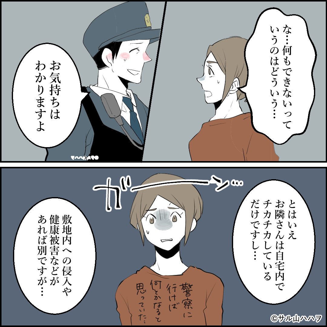 隣の家からのチカチカが止まない話【07】「対面」 2022/09/10 【連載】隣の家からのチカチカが止まない話実話にフェイクを入れてフィクションにしています。【前の話】 【最初から読む】 出会ってしまった話警察も役所もチカチカだけでは動けない…【次のお話】 【他の裏マンガ】\不倫相手が結婚式に来た話/ \初婚の妻が別の男と結婚してた話/ \無神経な後輩がつらい先輩の話/ \パパの不倫を追跡した話/ ヒンッ!!(;Д;) 「隣家のチカチカが止まない」カテゴリの最新記事 タグ :#連載#漫画#隣人トラブル#コミックエッセイ#衝撃#一戸建て#ブログ#修羅場#漫画が読めるハッシュタグ#怖い話 < 前の記事次の記事 > コメント