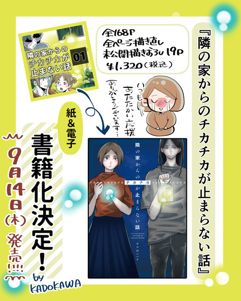 【お知らせ】『隣の家からのチカチカが止まらない話』発売決定! こんばんは!去年このブログで連載していた『隣の家からのチカチカが止まらない話』ですが(連載時は『隣の家からのチカチカが止まない話』)このたび書籍化することになりました!!紙・電子書籍ともに9/14(木)発売予定です!\タップするとamazonに飛びます/\amazon予 ... 2023/07/25 続きを読む